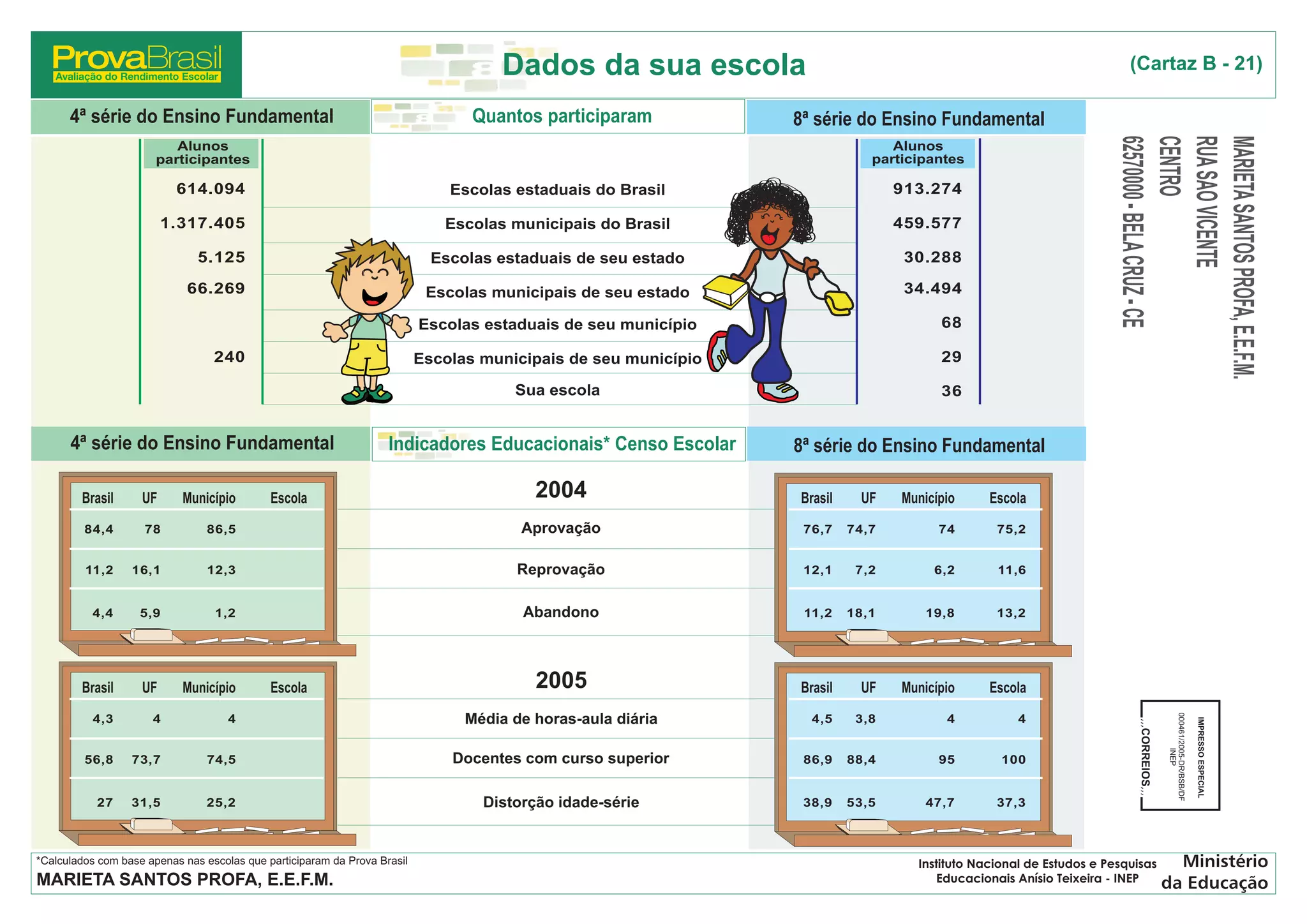 Este cartaz apresenta dados estatísticos sobre a escola, incluindo o número de alunos matriculados na 4a e 8a séries do ensino fundamental em escolas estaduais, municipais e na própria escola. Também mostra indicadores educacionais como taxa de aprovação, reprovação e abandono, assim como a média de horas-aula diária e percentual de professores com curso superior. Gráficos de barras exibem o desempenho dos alunos da escola em língua portuguesa e matemática na 4