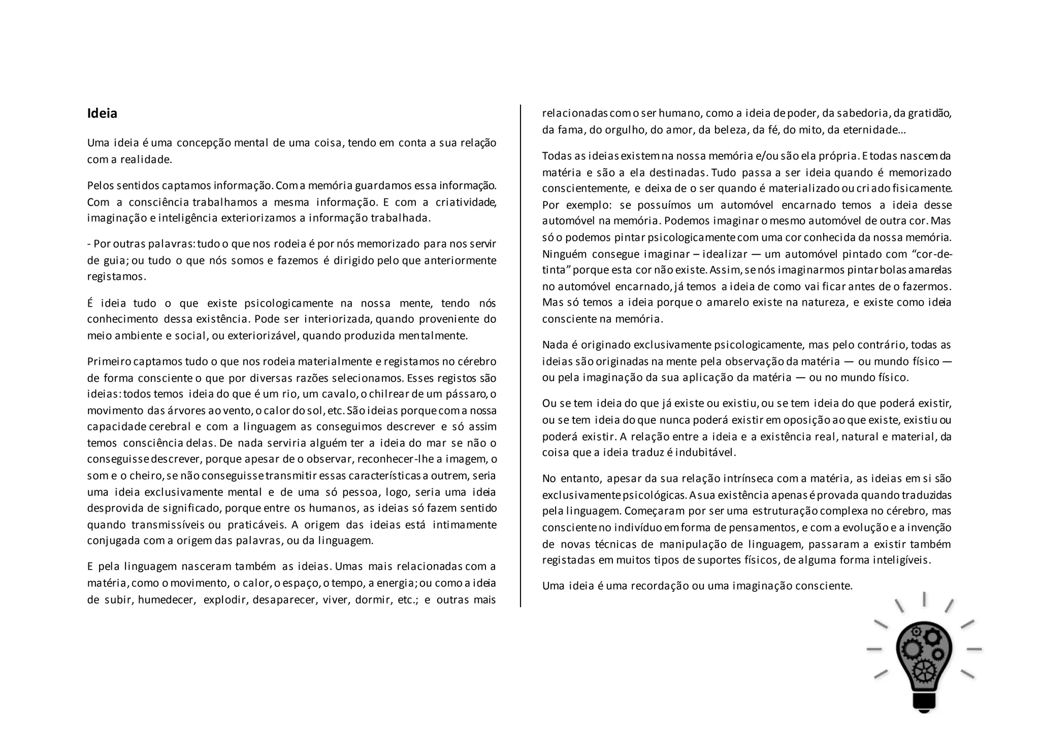 Uma ideia é uma concepção mental de algo relacionado à realidade, originada pela observação do mundo físico ou pela imaginação de sua aplicação. As ideias são armazenadas na memória e traduzidas pela linguagem, permitindo sua comunicação e existência psicológica. Embora relacionadas à matéria, as ideias existem principalmente na mente, sendo provadas por sua tradução em pensamentos ou registros físicos.