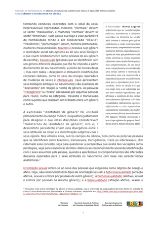 O documento aborda a formação de educadores em gênero, sexualidade e relações étnico-raciais, discutindo conceitos como identidade de gênero e orientação sexual dentro de um contexto cultural ocidental. Destaca-se a construção social da heteronormatividade e suas implicações sobre a violência contra identidades não conformistas, além de questionar a patologização de diferentes orientações sexuais. A ORIENTAÇÃO sexual é apresentada como uma parte intrínseca da identidade humana, que reflete contextos sociais e não é meramente uma escolha individual.