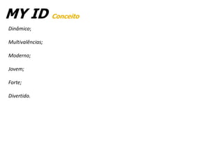 O documento descreve o conceito de identidade visual "MY ID" que é dinâmico, multifacetado e moderno. A identidade visual incorpora elementos gráficos como círculos e uma paleta de cores representando história, tecnologia e paixão. O objetivo é transmitir modernidade e dinamismo para um público entre 18-35 anos.