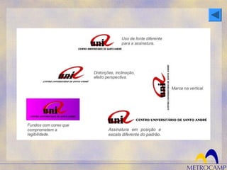 O documento discute os elementos essenciais da identidade visual de uma empresa, incluindo a logomarca, cores, tipografia e diretrizes para aplicação consistente desses elementos em diferentes materiais de comunicação para estabelecer uma imagem unificada da marca.