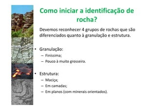 O documento descreve os quatro grupos principais de rochas que podem ser diferenciados pela granulação e estrutura, e fornece detalhes sobre como identificar rochas sedimentares, ígneas e metamórficas.
