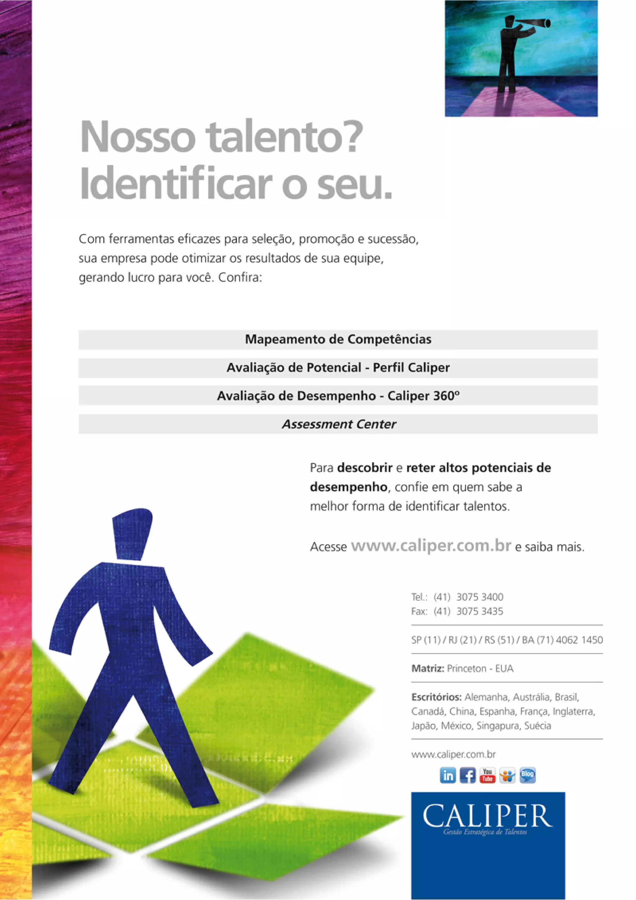 Nosso talento? Identificar o seu. Com ferramentas eficazes para seleção, promoção e sucessão, sua empresa pode otimizar os resultados de sua equipe, gerando lucro para você. Fale com a Caliper: (41) 3075-3400 e (11) (21) (51) (71) 4062-1450 www.caliper.com.br