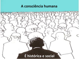 A consciência humana é histórica e social, variando entre culturas e épocas como a consciência do homem ocidental-cristão, oriental-islâmico, da Idade Média e rural. A ideologia é uma forma ilusória de consciência que cria conceitos de dominação, caracterizada pela anterioridade, generalização e lacuna de suas idéias. Os meios de comunicação, como super-heróis, reproduzem a ideologia dominante.