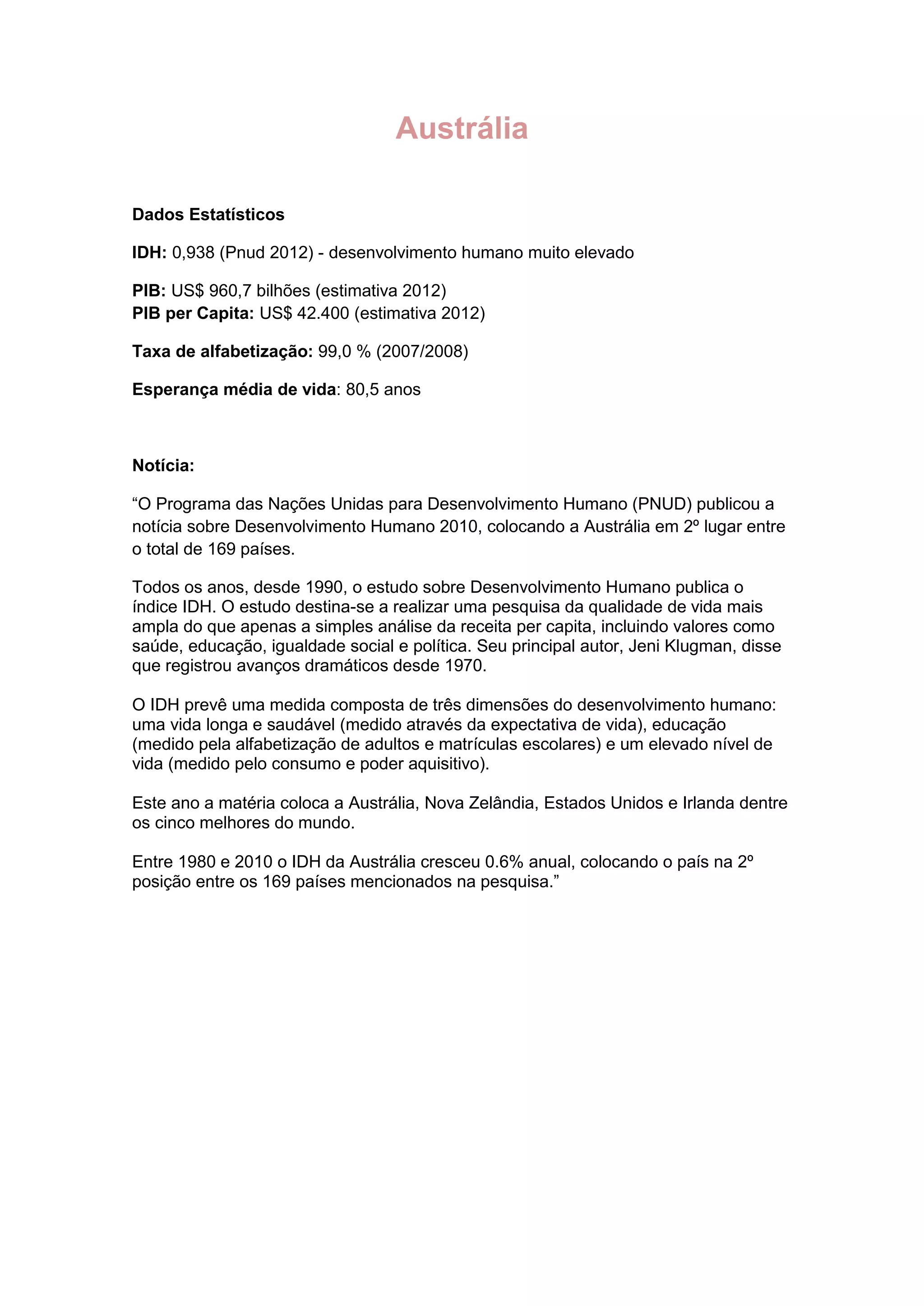 O documento fornece dados estatísticos e notícias sobre o desenvolvimento humano na Austrália e no Burundi. A Austrália tem um IDH muito elevado de 0,938 e está em segundo lugar no ranking global de desenvolvimento humano, enquanto o Burundi tem um baixo IDH de 0,35 e está entre os piores colocados. A notícia também menciona que a Noruega lidera o ranking de IDH em 2011.