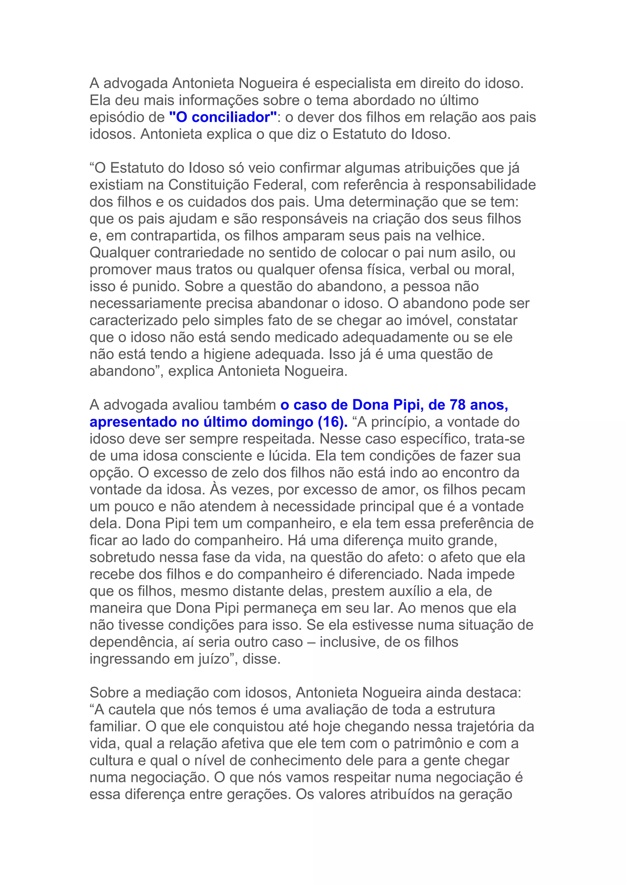 A advogada Antonieta Nogueira discute o dever legal dos filhos de cuidarem dos pais idosos, como definido no Estatuto do Idoso. Ela explica que os filhos são responsáveis por fornecer cuidados aos pais na velhice, e abandono ou maus-tratos são puníveis. Antonieta também avalia o caso específico de "Dona Pipi", concluindo que sua vontade de viver com o companheiro deve ser respeitada se ela estiver mentalmente capacitada.