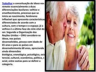 O documento discute os desafios enfrentados por idosos no mercado de trabalho, incluindo preconceitos que limitam suas oportunidades de emprego. Também aborda como a necessidade de complementar a renda da aposentadoria e o desejo de se manter ativo levam muitos idosos a continuarem trabalhando quando possível.