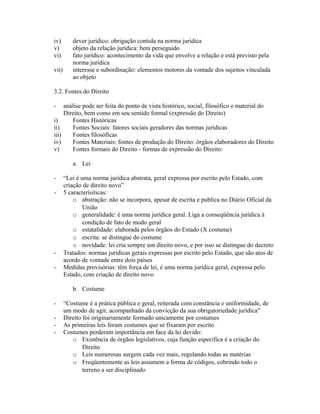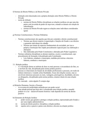O documento discute diferentes tipos de normas jurídicas e fontes do direito. Apresenta a distinção entre direito público e privado, normas constitucionais e ordinárias. Também define relação jurídica e seus elementos, e lista as principais fontes formais do direito como leis, costumes, jurisprudência e doutrina.