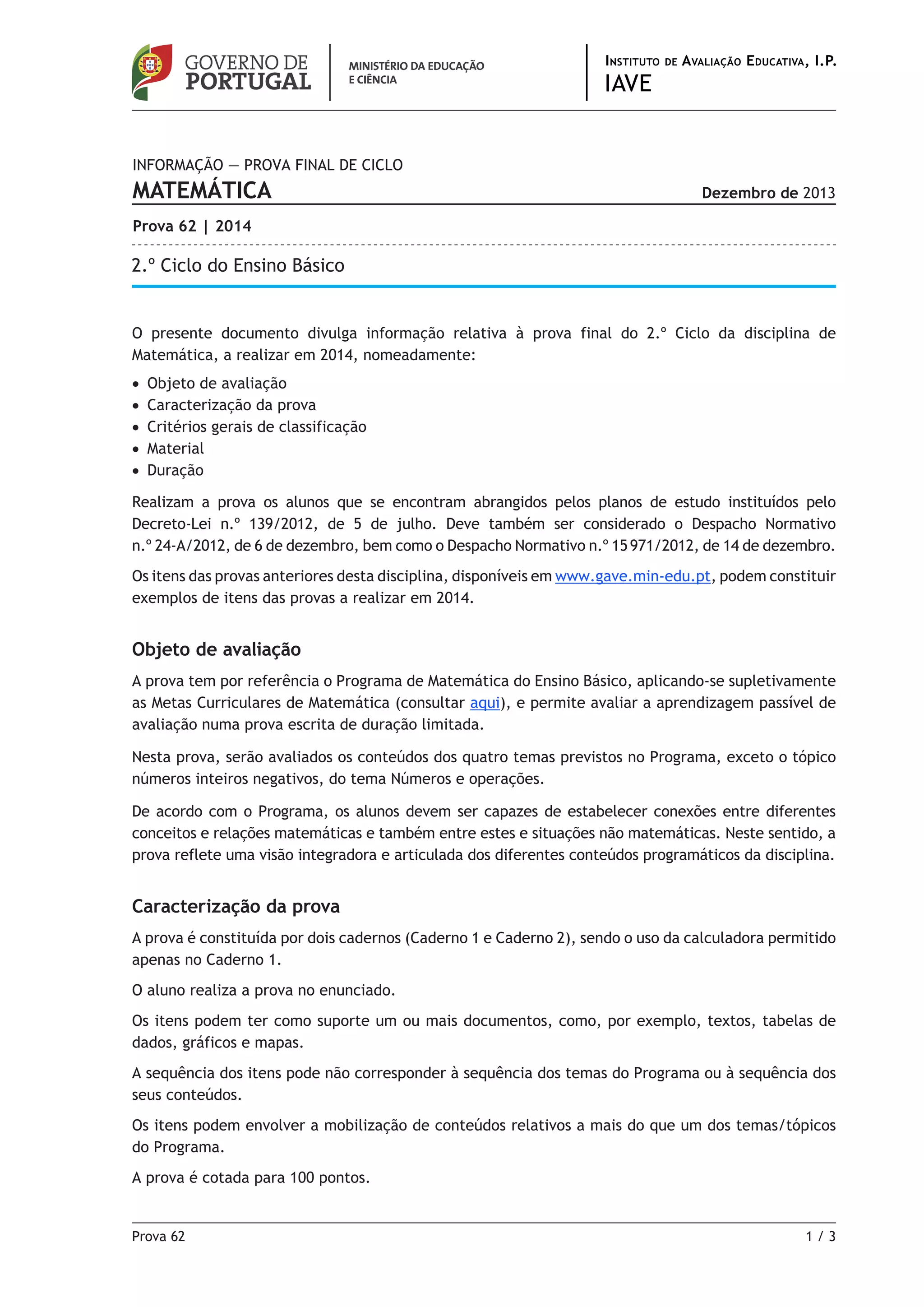 Este documento fornece informações sobre a prova final de matemática do 2o ciclo do ensino básico em 2014, incluindo o escopo da avaliação, características da prova, critérios de classificação, materiais permitidos e duração. A prova avaliará conteúdos de quatro temas do programa excluindo números inteiros negativos e consistirá em itens de seleção e construção cotados de 3 a 8 pontos. Ela terá uma duração total de 90 minutos distribuídos em dois cadernos.