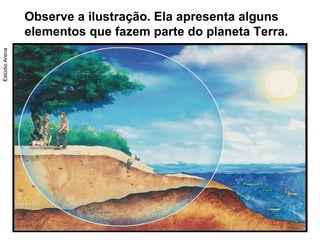 Este documento apresenta os principais elementos que compõem o interior e a superfície da Terra. Descreve a formação do planeta a partir de uma bola incandescente há bilhões de anos, dando origem à litosfera, hidrosfera, atmosfera e biosfera. Também explica o movimento das placas tectônicas, que causam terremotos e formam montanhas quando colidem.