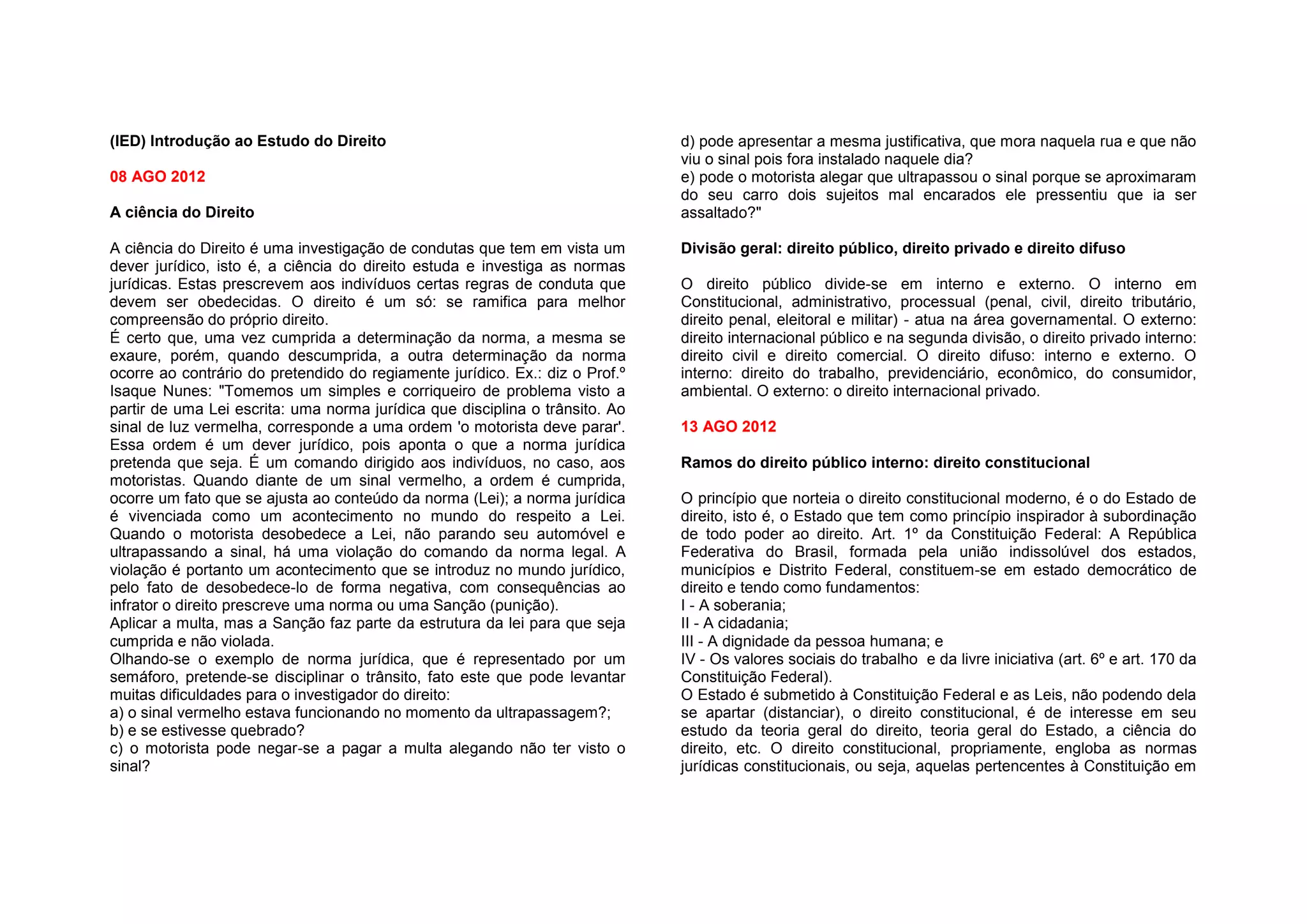 O documento discute vários tópicos sobre direito, incluindo: 1) a definição de direito e suas divisões principais como direito público, privado e difuso; 2) os principais ramos do direito público como constitucional, administrativo e tributário; 3) os ramos do direito privado como civil e comercial; e 4) conceitos básicos como sujeitos de direito e capacidade jurídica.