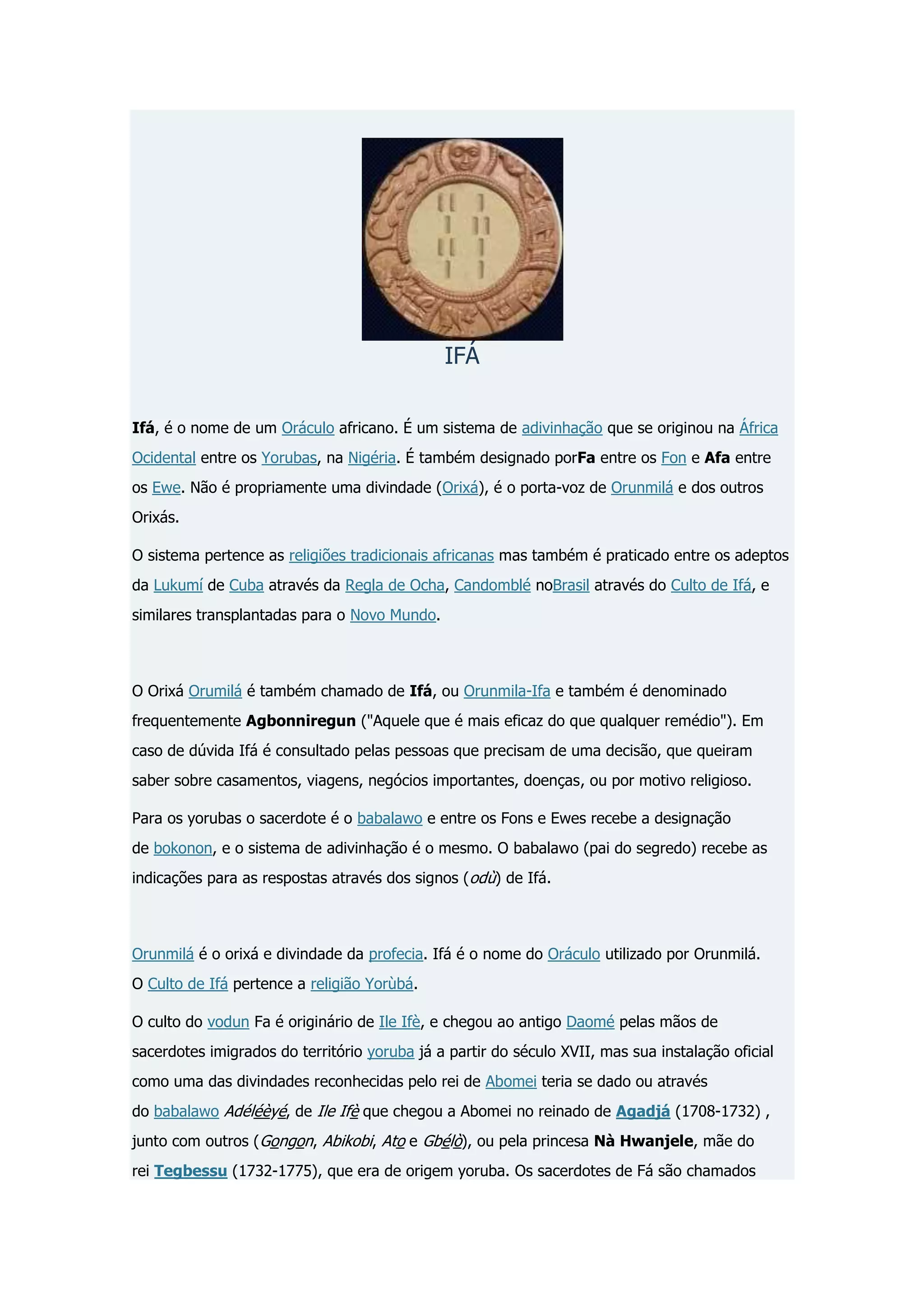 Ifá é um sistema de adivinhação originário da África Ocidental entre os povos Yorubá. O sistema é conduzido pelos babalawos e utiliza métodos como o Opele-Ifá, Ikins e Merindilogun para interpretar os Odús e fornecer respostas aos consultantes. Ifá é considerado o porta-voz do Orixá Orunmilá.