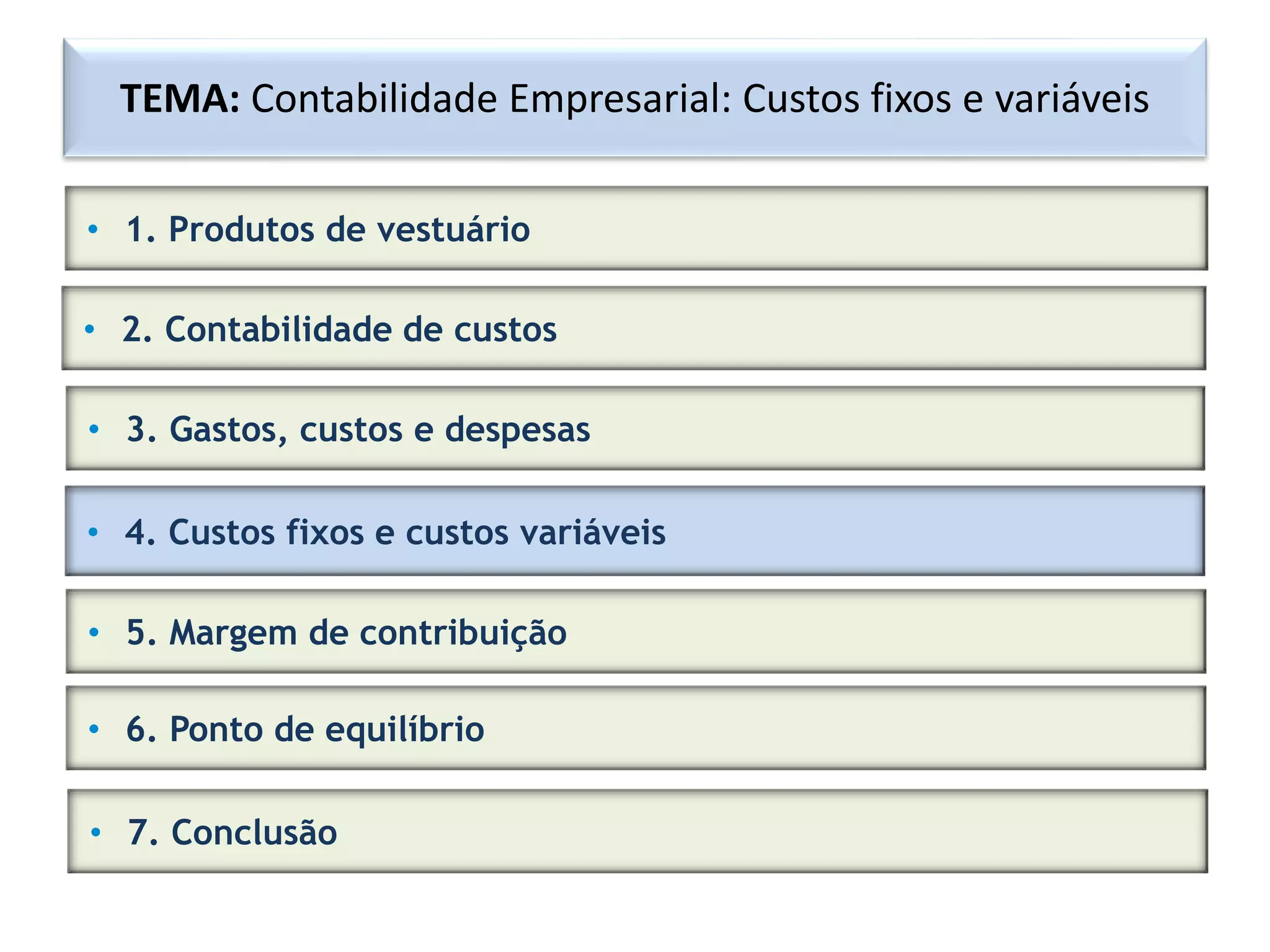 Este documento discute os conceitos de custos fixos e variáveis nas empresas de transporte e vestuário. Apresenta os conceitos de gastos, custos e despesas e explica que custos fixos permanecem constantes independente do volume de produção, enquanto custos variáveis alteram-se de acordo com a produção. Também define margem de contribuição e ponto de equilíbrio, este último representando o volume de produção necessário para cobrir todos os custos.