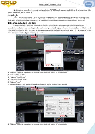 1) O documento fornece um tutorial passo-a-passo para operar o Boeing 737-800 no simulador de voo, desde o acionamento até o pouso no destino. 2) Inclui instruções para configurar a aeronave em modo "Cold and Dark", ligar os sistemas elétricos, alinhar o IRS, configurar rádio e transponder, preencher o FMC com rota e performance. 3) Fornece detalhes sobre a configuração para decolagem, incluindo flap de decolagem.