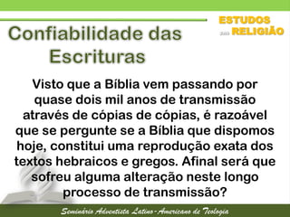 O documento discute a transmissão da Bíblia ao longo dos séculos e argumenta que apesar das cópias sucessivas, o texto bíblico que temos hoje é uma reprodução fiel dos originais hebraicos e gregos. Isso é evidenciado pela precisão, permanência e disseminação do texto bíblico.