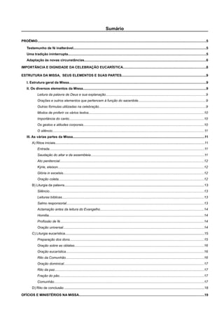1) O documento apresenta as normas para a celebração da Missa segundo o rito romano, destacando a natureza sacrificial da Eucaristia e a presença real de Cristo.