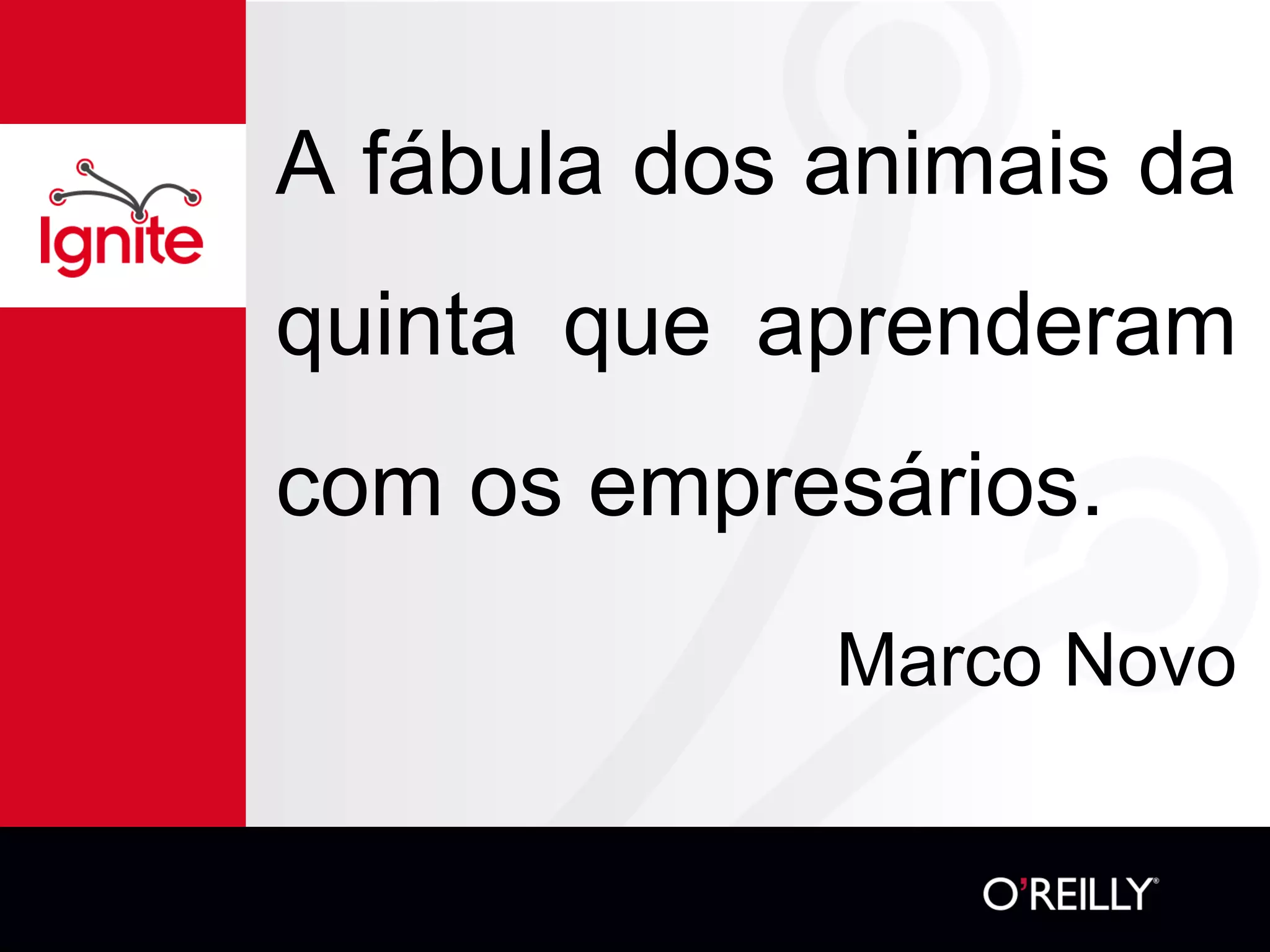 A fábula compara as práticas de negócios de empresas a animais de uma quinta, criticando abordagens como publicidade enganosa, falta de inovação, horários de trabalho rígidos e lealdade a maus clientes. Defende que as empresas devem se adaptar aos mercados, focar em clientes leais e produtos de valor, e não apenas em lucros rápidos.