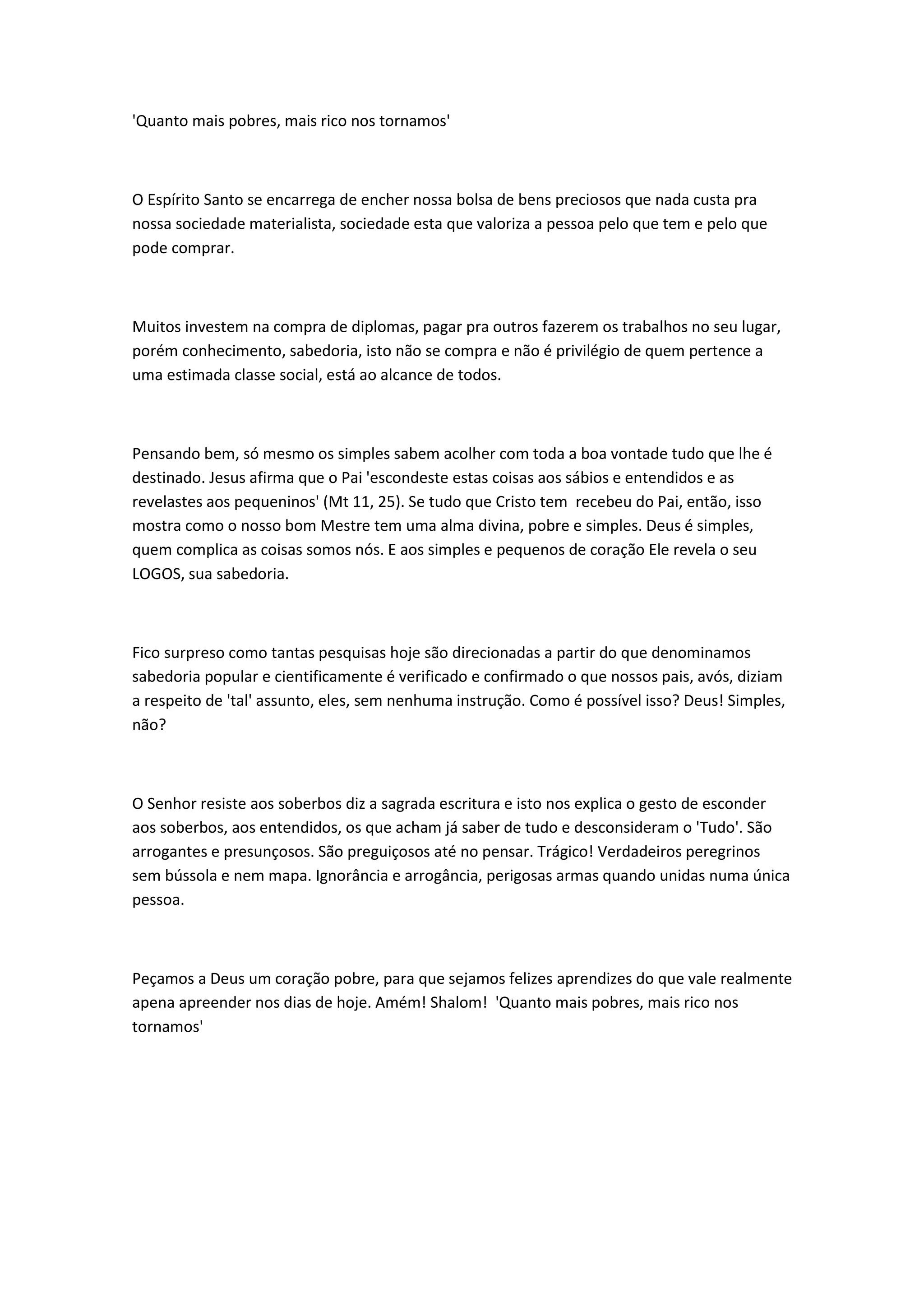 O documento discute como a pobreza espiritual e humildade levam à verdadeira riqueza e sabedoria. A sociedade valoriza as posses materiais, mas o conhecimento e entendimento vêm de Deus e estão ao alcance de todos, especialmente dos humildes. Cristo revela sua sabedoria aos pequenos e simples.
