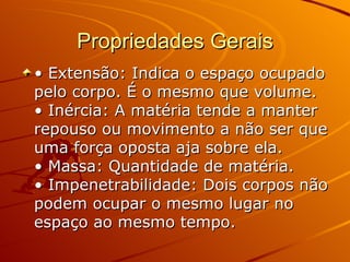 Este documento descreve as propriedades gerais e específicas da matéria. As propriedades gerais incluem extensão, inércia, massa e impenetrabilidade. As propriedades específicas incluem propriedades organolépticas como cor e odor, propriedades físicas como ponto de fusão e densidade, e propriedades químicas como combustão e hidrólise.