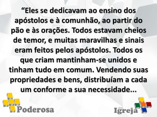 O documento descreve como a igreja primitiva se dedicava ao ensino dos apóstolos, à oração e à comunhão. Todos estavam cheios do temor do Senhor e realizavam muitos sinais e maravilhas. Eles compartilhavam tudo em comum e ajudavam os necessitados, crescendo em número diariamente e ganhando a simpatia do povo.