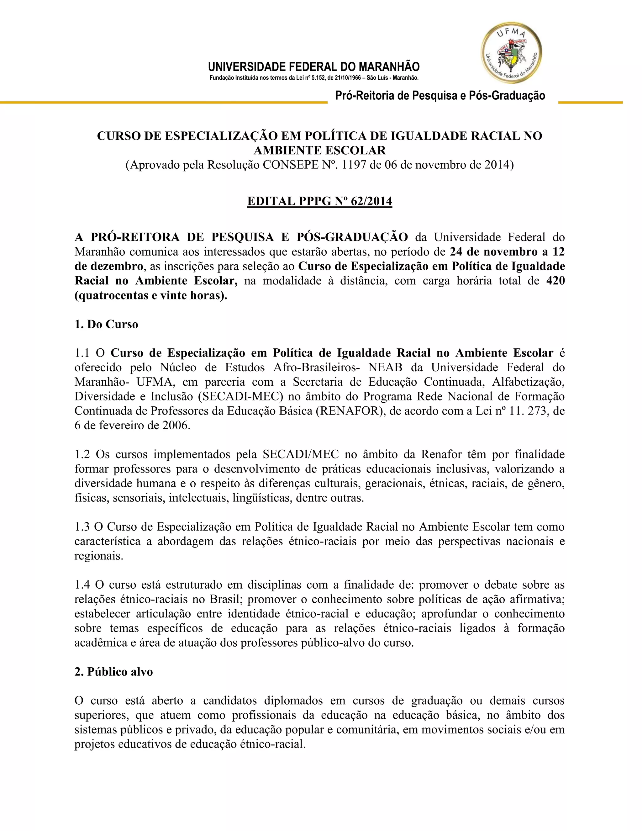 Este documento anuncia a abertura das inscrições para o Curso de Especialização em Política de Igualdade Racial no Ambiente Escolar oferecido pela Universidade Federal do Maranhão. O curso terá duração de um ano letivo com início em fevereiro de 2015 e será oferecido na modalidade a distância com encontros presenciais. Serão oferecidas 150 vagas distribuídas entre 5 polos de apoio presencial. O processo seletivo consistirá de uma prova escrita eliminatória e análise de curr