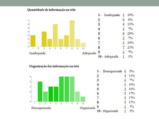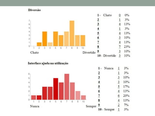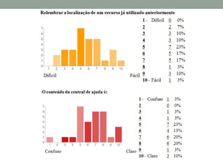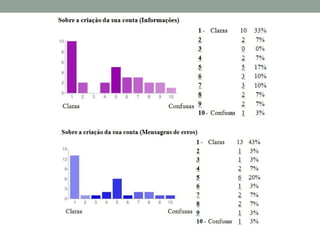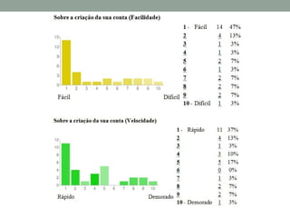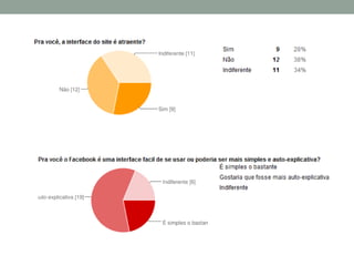 O documento resume um estudo sobre a usabilidade do Facebook realizado por meio de questionários com usuários. Os principais achados foram: a maioria dos usuários passa menos de 30 minutos no Facebook a cada acesso e começou a usar o site nos últimos 6 meses; a dificuldade mais comum encontrada foi no gerenciamento de amigos e configurações de privacidade; e as principais sugestões de melhoria foram uma interface mais simples e funcionalidades agrupadas logicamente.
