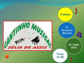O documento descreve um encontro musical que apresentou canções típicas da música brasileira de diferentes regiões e épocas. Apresentou breves biografias de compositores importantes como Luiz Gonzaga, Catullo da Paixão Cearense e Zé Dantas, e resumiu canções clássicas como "Luar do Sertão", "Cintura Fina" e "ABC do Sertão". O encontro reuniu alunos e professores para celebrar a rica herança musical do Brasil.
