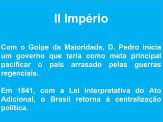 O documento descreve alguns aspectos do Império do Brasil no século XIX, como a adoção de tarifas protecionistas, a crise do sistema escravista e o aumento da produção e exportação de café.