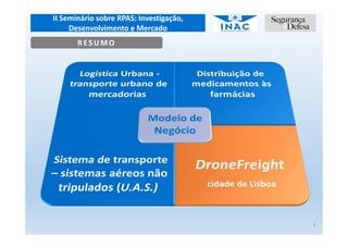 Este documento apresenta um estudo de caso sobre o uso de drones para distribuição de medicamentos em farmácias de Lisboa. Resume os desafios logísticos das farmácias, o potencial do drone freight para melhorar a distribuição e a qualidade de serviço, e analisa os custos e benefícios de um modelo de negócio de aluguer de drones para este fim.