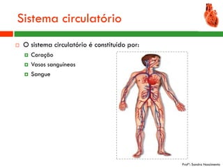 O documento descreve o sistema circulatório humano, incluindo seus principais componentes e funções. O sistema é constituído pelo coração, vasos sanguíneos e sangue. O coração bombeia o sangue através de duas circulações, a grande circulação que leva oxigênio para as células e a pequena circulação pulmonar para realizar trocas gasosas. O sangue contém elementos como plaquetas, glóbulos brancos e vermelhos que desempenham funções importantes como coagulação, defesa e transporte de gases.