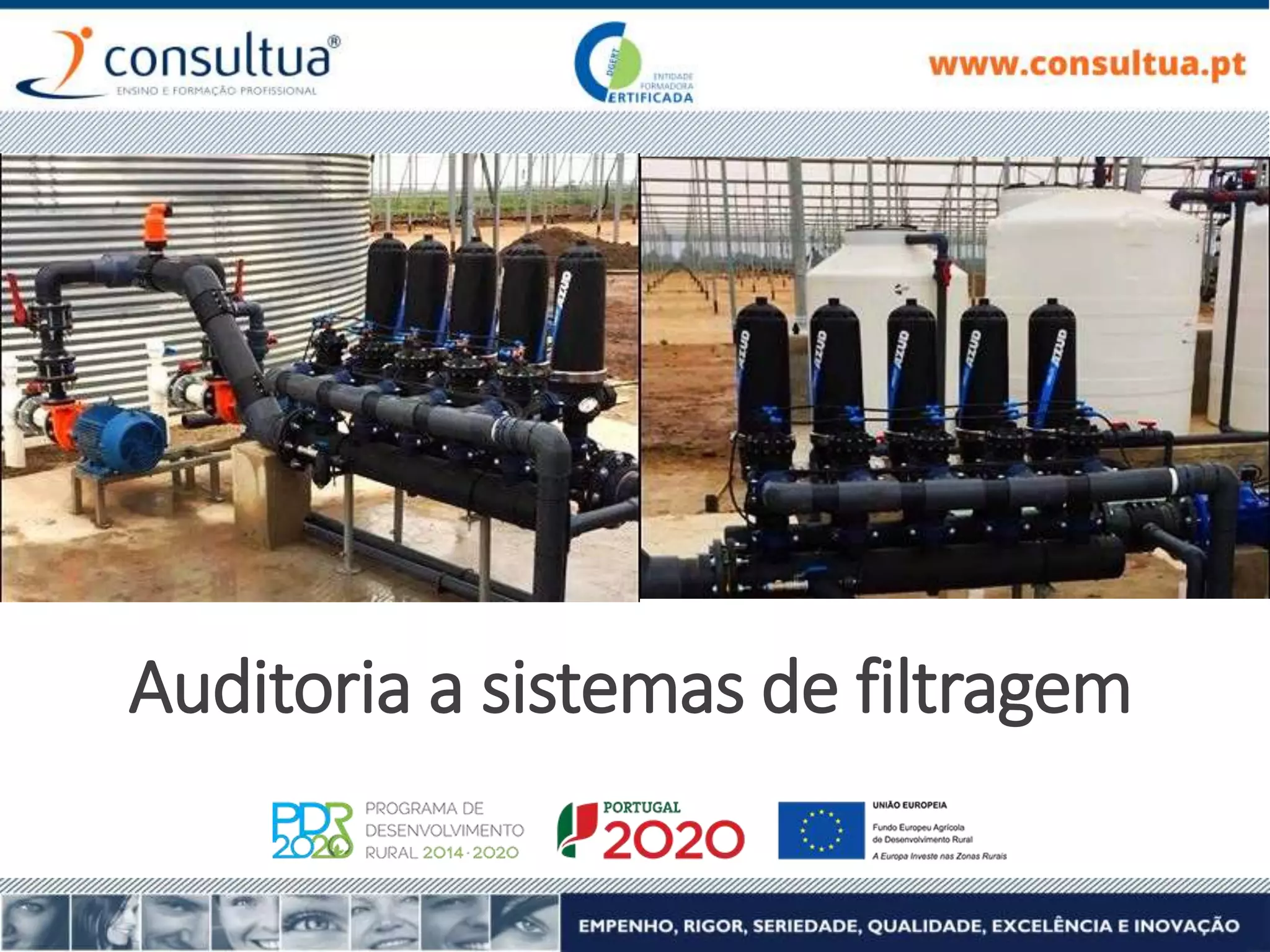 O documento descreve os testes e avaliações realizados em sistemas de filtragem, incluindo a verificação do comprimento e resistência dos filtros, medições de perda de carga e diferencial de pressão antes e depois da limpeza, e testes para garantir o desempenho e mecanismos de proteção dos sistemas.