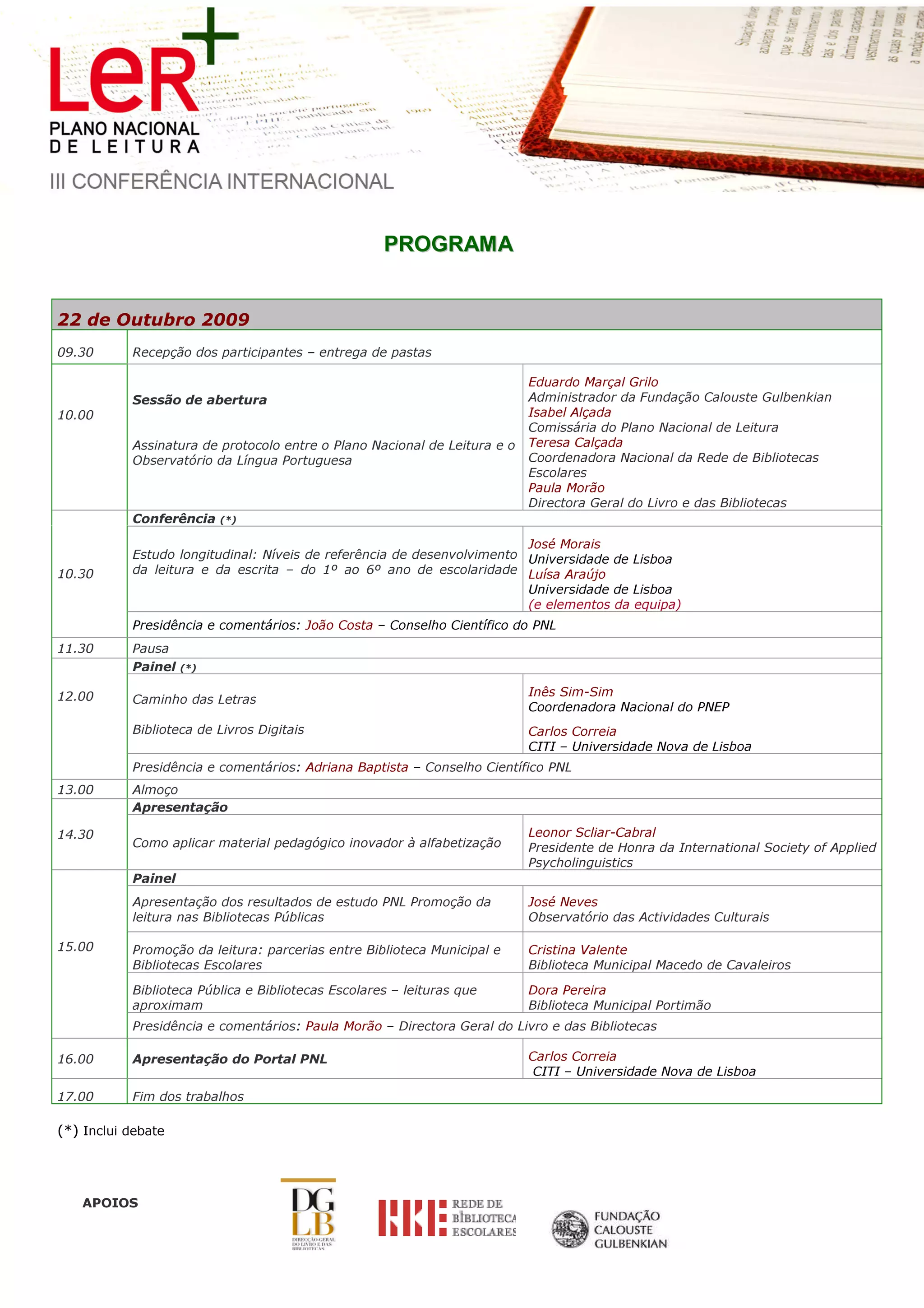 O documento apresenta a programação de dois dias de um evento sobre promoção da leitura. No primeiro dia, há apresentações sobre estudos longitudinais sobre desenvolvimento da leitura e escrita, o projeto Caminho das Letras e parcerias entre bibliotecas públicas e escolares. No segundo dia, há apresentações sobre o projeto BookStart do Reino Unido e projetos portugueses como Ler+ e aLeR+.