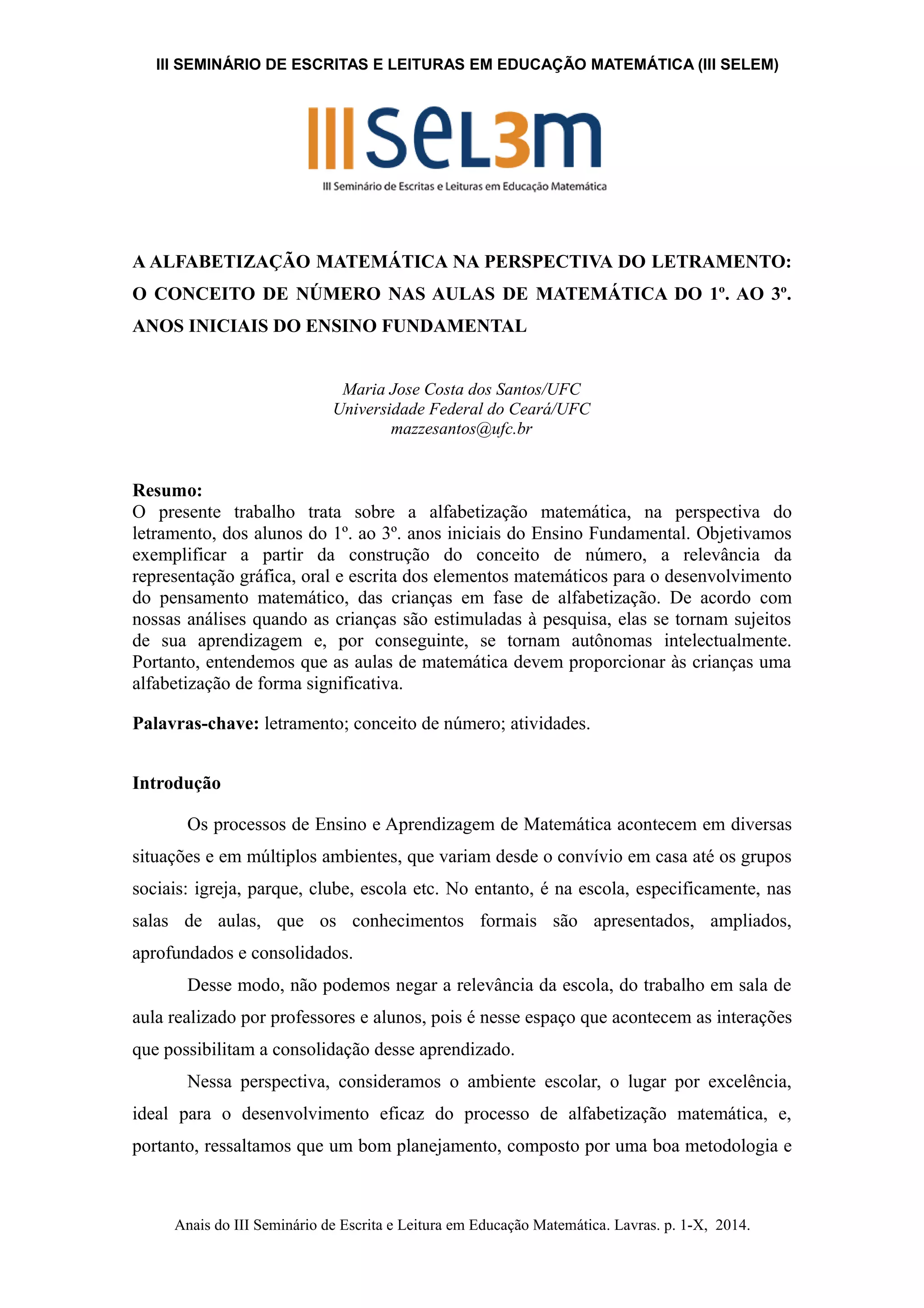 O documento discute a alfabetização matemática na perspectiva do letramento para alunos dos anos iniciais do ensino fundamental. Ele explica que o conceito de número deve ser construído através de atividades que estimulem classificação, ordenação e quantificação de objetos. Além disso, defende que as aulas de matemática devem proporcionar oportunidades para que as crianças se desenvolvam como seres pensantes por meio do letramento matemático.