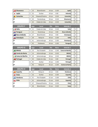 O documento apresenta a programação completa da Copa do Mundo de 2010 na África do Sul, com a divisão dos grupos, jogos, locais e horários. Também inclui as tabelas de classificação em branco e o cronograma preliminar para as oitavas e quartas de final.