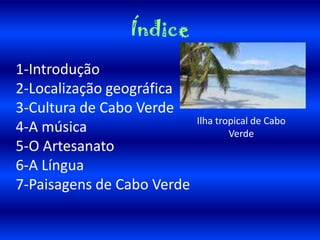Cabo Verde é um arquipélago africano composto por dez ilhas, localizado na costa ocidental da África. Sua cultura é caracterizada pela música, como a morna e o funaná, e pelo artesanato tradicional em cerâmica e tecelagem. A língua oficial é o português, mas o crioulo cabo-verdiano também desempenha um papel importante na identidade cultural local.