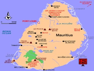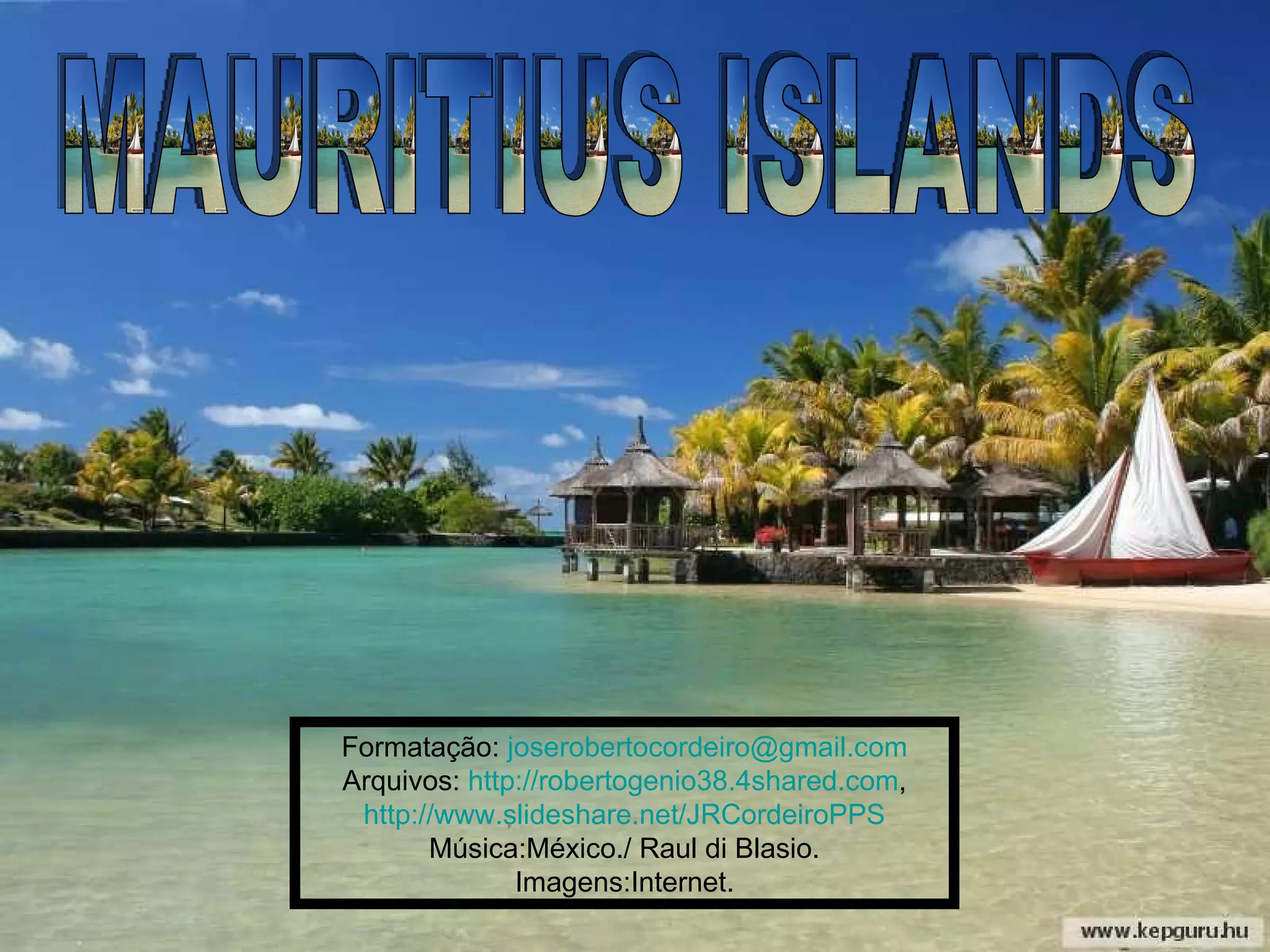 O documento fornece links para arquivos e imagens sobre as Ilhas Maurício. Inclui um endereço de email e links para arquivos compartilhados e apresentações sobre as Ilhas Maurício.