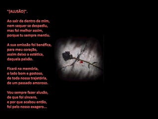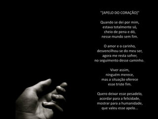 O documento contém cinco poemas curtos sobre temas como desilusão, fé, a vida de um poeta e uma oração para uma amiga. Os poemas expressam sentimentos como saudade, esperança e amor através do uso de palavras e metáforas.