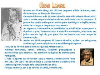 Ilse Losa nasceu na Alemanha em 1913, mas teve de fugir do país durante o regime nazi por ser judia, refugiando-se em Portugal em 1934. Radicou-se no Porto, onde se casou e publicou vários livros infantis e romances, recebendo o Prémio Gulbenkian de Literatura para Crianças em 1984. Faleceu no Porto em 2006, aos 92 anos.