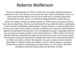 Roberto Wolfenson é um dos mais renomados fotógrafos brasileiros, conhecido por seus ensaios de moda, nudez e publicidade. Ele nasceu em 1954 em São Paulo e teve sua primeira experiência profissional aos 16 anos, posteriormente abrindo seu próprio estúdio em 1978. Sua carreira decolou após exposições como "Jardim da Luz" em 1996, retratando figuras políticas e artísticas brasileiras. Atualmente trabalha para publicações nacionais e internacionais, alternando entre arte, editorial e publicidade