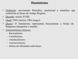 O documento descreve o Iluminismo, um movimento intelectual e científico do século XVIII que questionou as bases do Antigo Regime na Europa. Os principais pensadores iluministas defendiam a razão, a ciência e as liberdades individuais, enquanto monarcas como José II da Áustria e Catarina, a Grande da Rússia promoveram reformas influenciadas pelas ideias iluministas sem abdicar completamente de seu poder absoluto. O Iluminismo influenciou movimentos que abalaram o Antigo Regime nos séculos XVIII e XIX