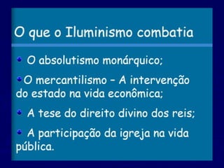 O documento descreve o Iluminismo, um movimento intelectual do século XVIII que valorizava o uso da razão e questionava a visão teocêntrica da época. Filósofos iluministas como Locke, Montesquieu e Voltaire defenderam ideias como liberdade individual, divisão de poderes e liberdade de expressão. Rousseau promoveu a ideia de que os homens nascem bons e a sociedade os corrompe. A Enciclopédia difundiu as novas ideias iluministas.