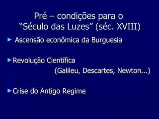 1) O Iluminismo surgiu no século XVIII em meio à ascensão da burguesia e da revolução científica.