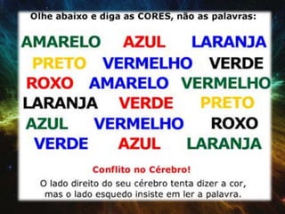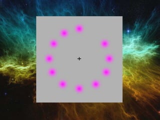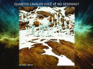 Este documento apresenta várias ilusões de ótica e desafios visuais, incluindo imagens ambíguas que podem ser interpretadas de diferentes maneiras e exercícios para ver imagens após fixar os olhos em pontos centrais de figuras. O objetivo é demonstrar como a percepção visual pode ser enganada e imagens podem emergir da fixação ocular.