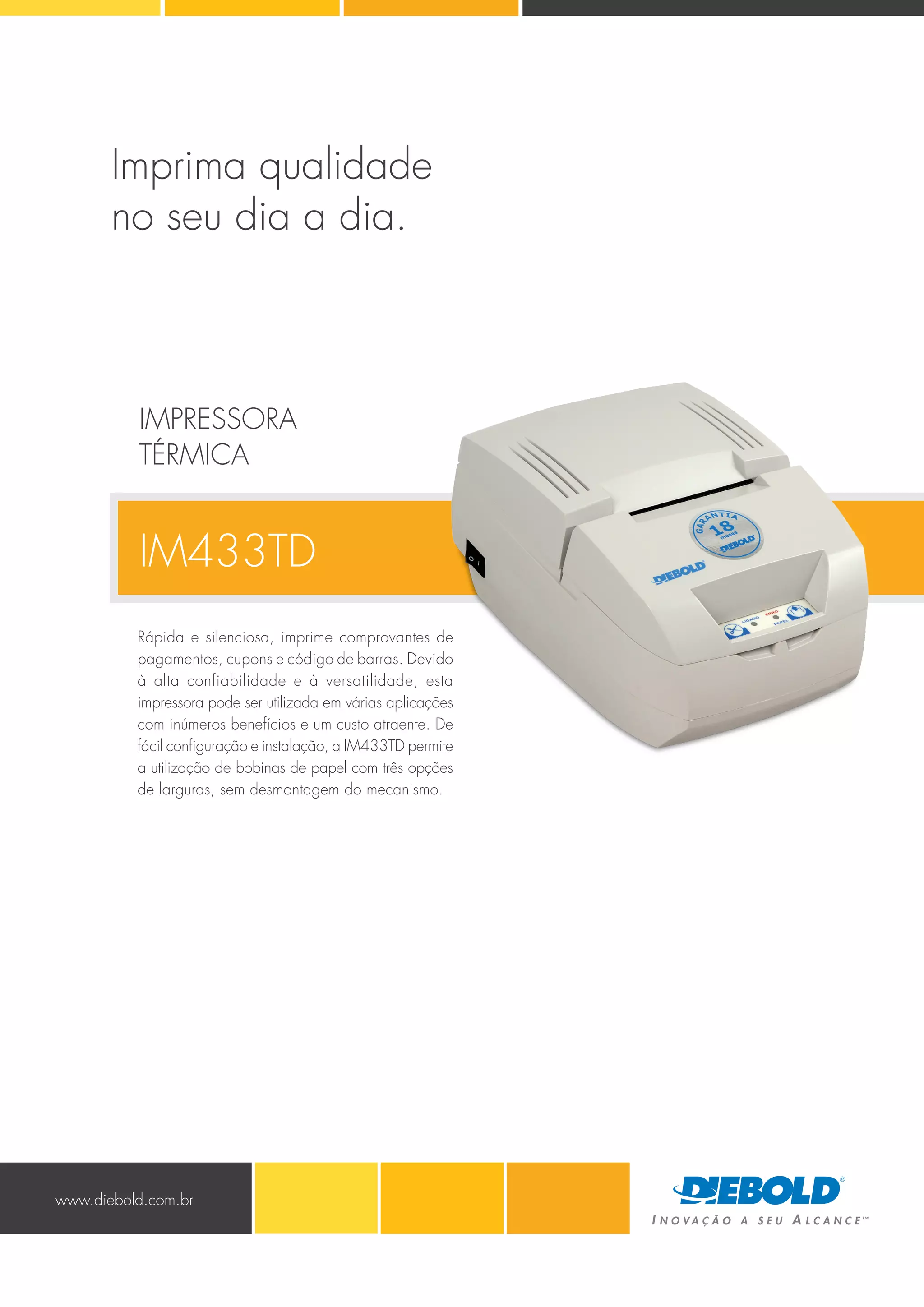 A impressora térmica IM433TD da Diebold possui alta confiabilidade, versatilidade e custo atraente, permitindo impressão rápida e silenciosa em várias aplicações como cozinhas, estacionamentos e hotéis. Pode imprimir comprovantes, cupons e códigos de barras em três larguras de papel sem desmontagem.