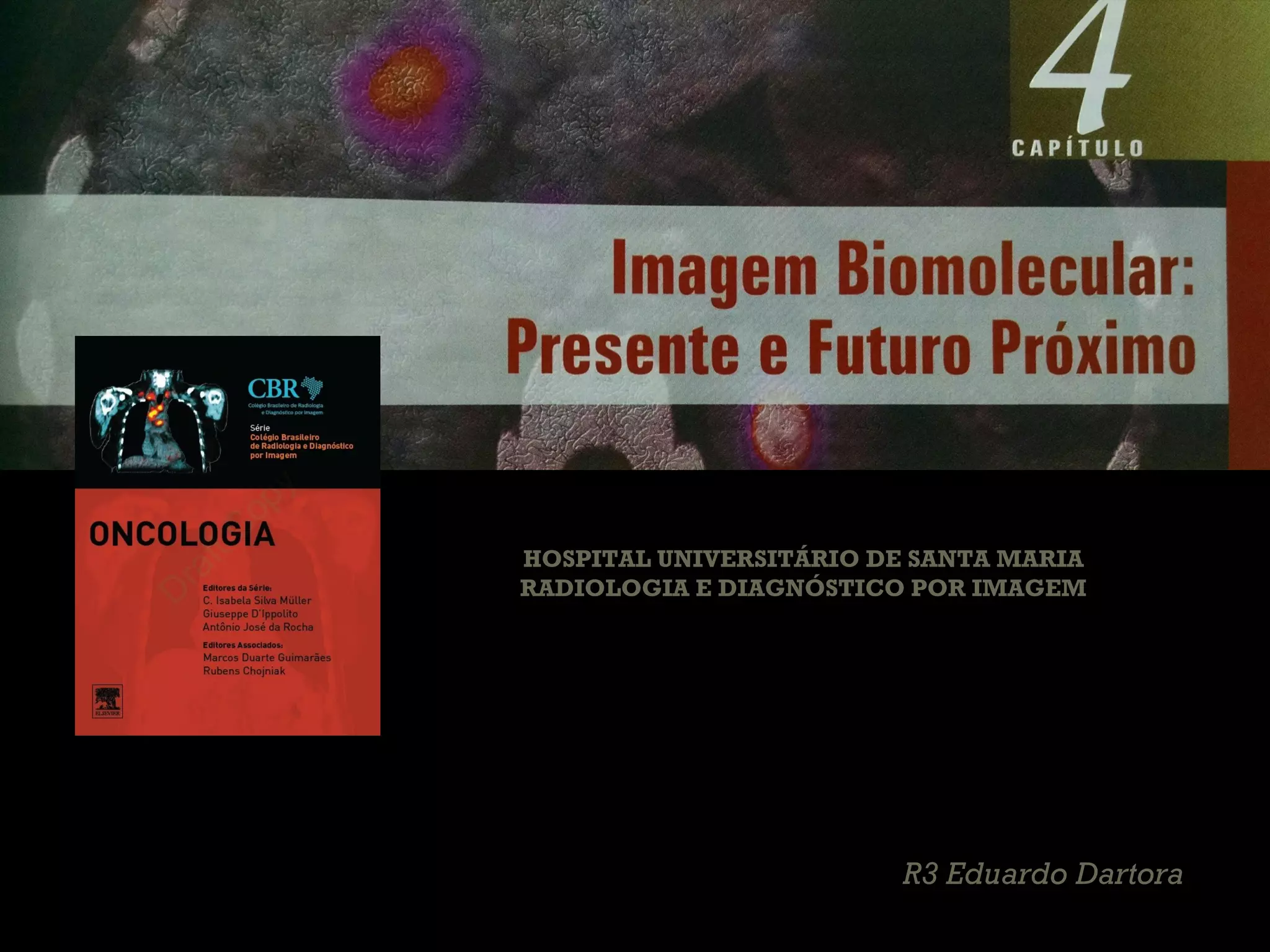 O documento discute as aplicações da imagem médica, incluindo ressonância magnética (RM), tomografia computadorizada (TC) e exames funcionais como tomografia por emissão de pósitrons (PET) e cintilografia (SPECT). Aborda o uso desses exames para avaliar a extensão do câncer, resposta ao tratamento, detecção precoce de recidiva e escolha da terapia mais adequada.
