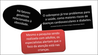 O documento discute a relação entre imagem corporal, obesidade e atividade física. Aborda como a imagem corporal é influenciada por fatores sociais e culturais e como a insatisfação com a imagem corporal está associada ao sobrepeso. Também mostra que a atividade física pode melhorar a imagem corporal e que programas de exercícios devem respeitar as individualidades para serem efetivos.