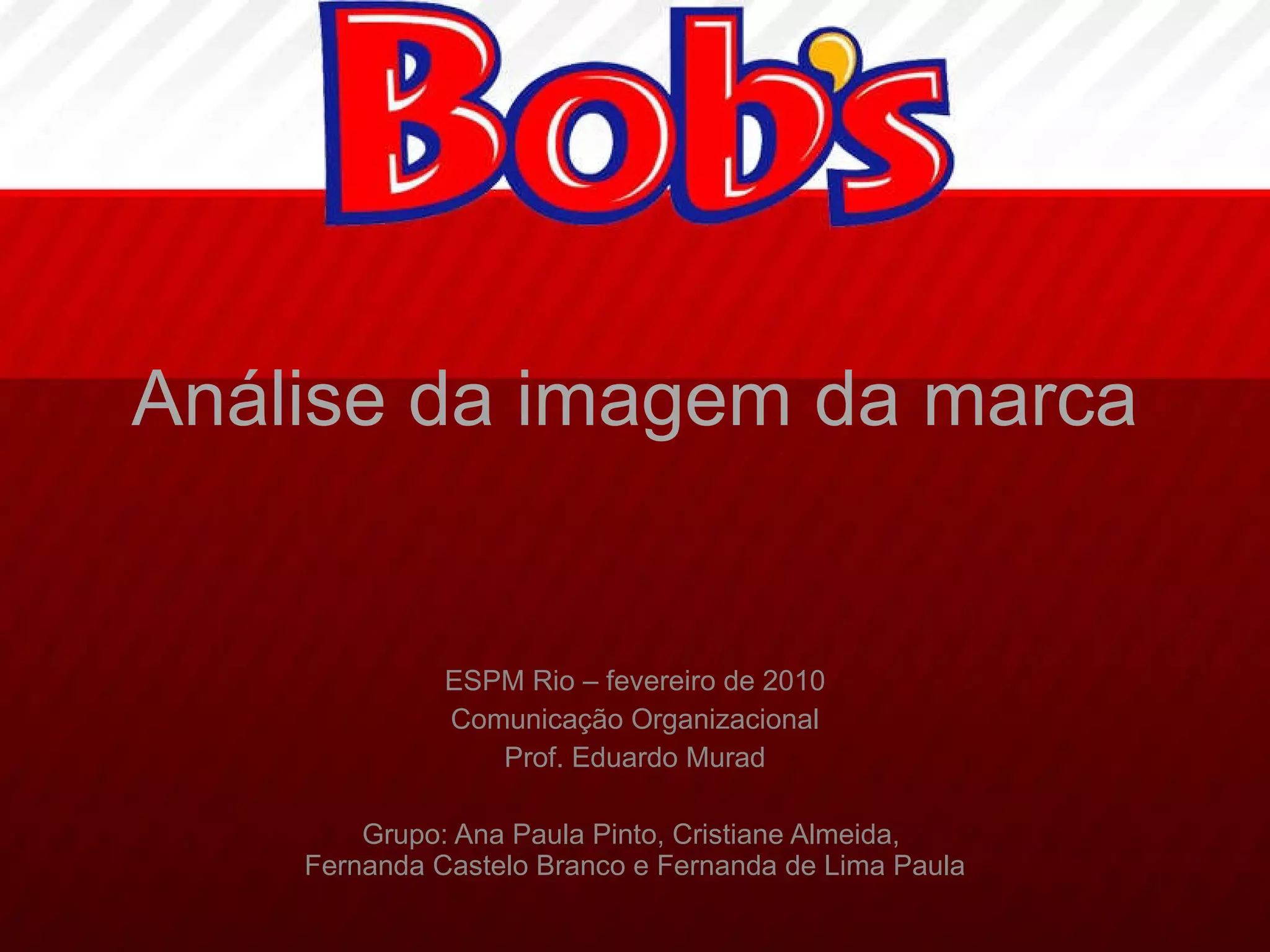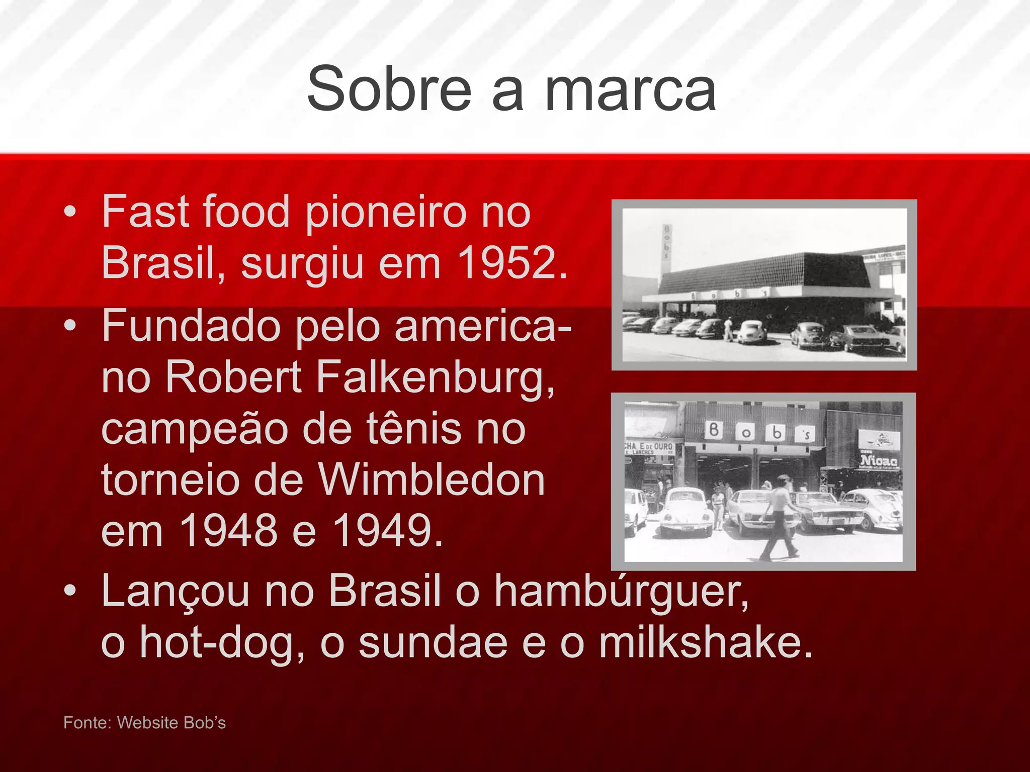 O documento resume a história da marca Bob's desde sua fundação em 1952 até 2010. Apresenta informações sobre a expansão da rede de franquias, geração de empregos, campanhas publicitárias, canais de comunicação e presença em redes sociais. Também discute críticas sobre o atendimento e condições de trabalho recebidas pela marca.