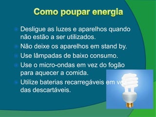 O documento fornece dicas para economizar energia em casa, incluindo desligar luzes desnecessárias, usar aparelhos de baixo consumo, isolar adequadamente a casa com vidros duplos e isolamento térmico, e aproveitar fontes renováveis como energia solar e eólica.