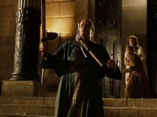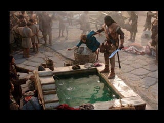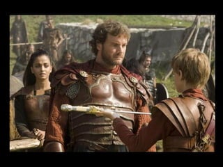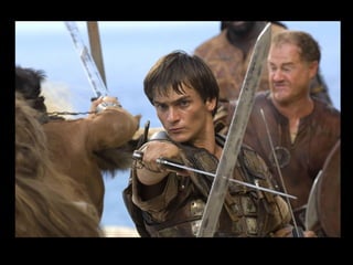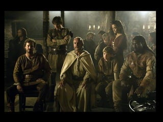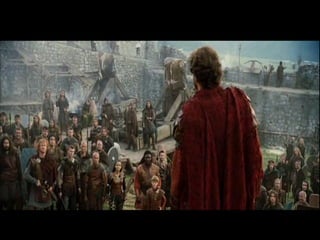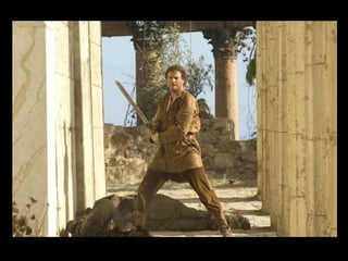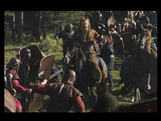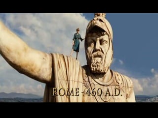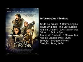 O documento resume o enredo do filme A Última Legião, contando a história do jovem Romulus Augustus, último imperador romano do ocidente, e como ele acaba encontrando refúgio na Britânia com a IX Legião após a queda de Roma, onde acaba se tornando o lendário Rei Arthur. O texto também fornece contexto histórico sobre o período da queda do Império Romano e da Idade Média.