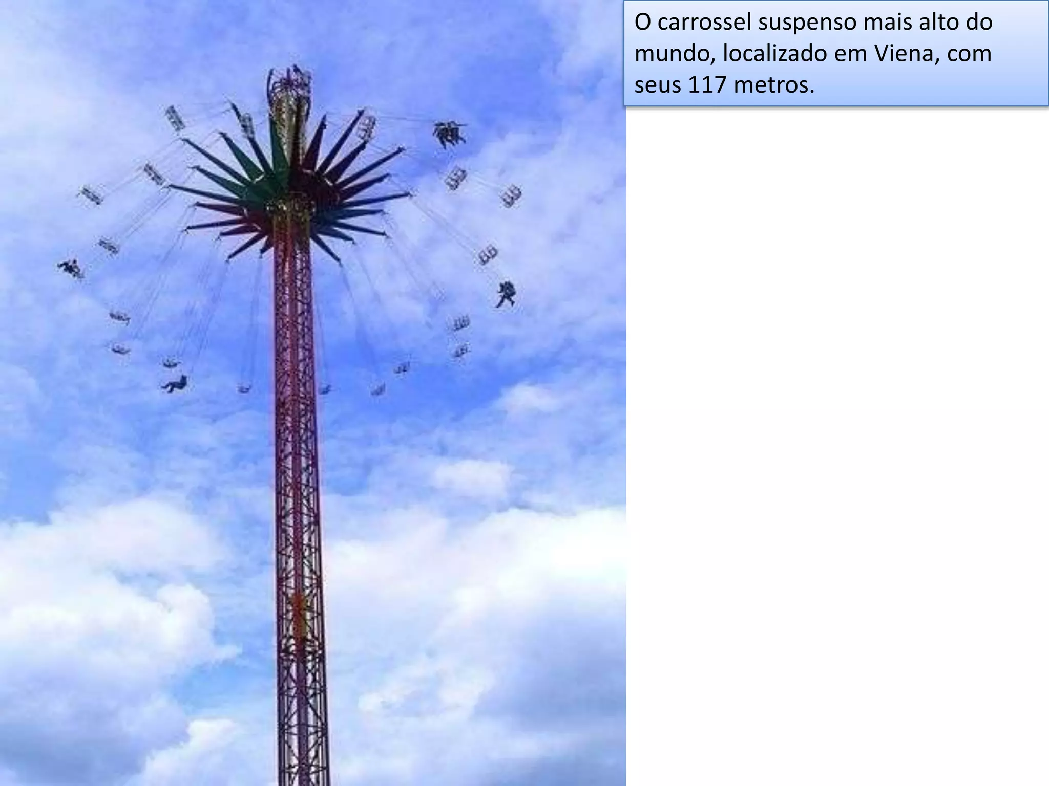 O documento apresenta diversas imagens notáveis de paisagens naturais e construções ao redor do mundo, incluindo o carrossel mais alto do mundo na Áustria, o Lago Emerald na Nova Zelândia, arranha-céus em Dubai, e uma ponte de 36 quilômetros na China.